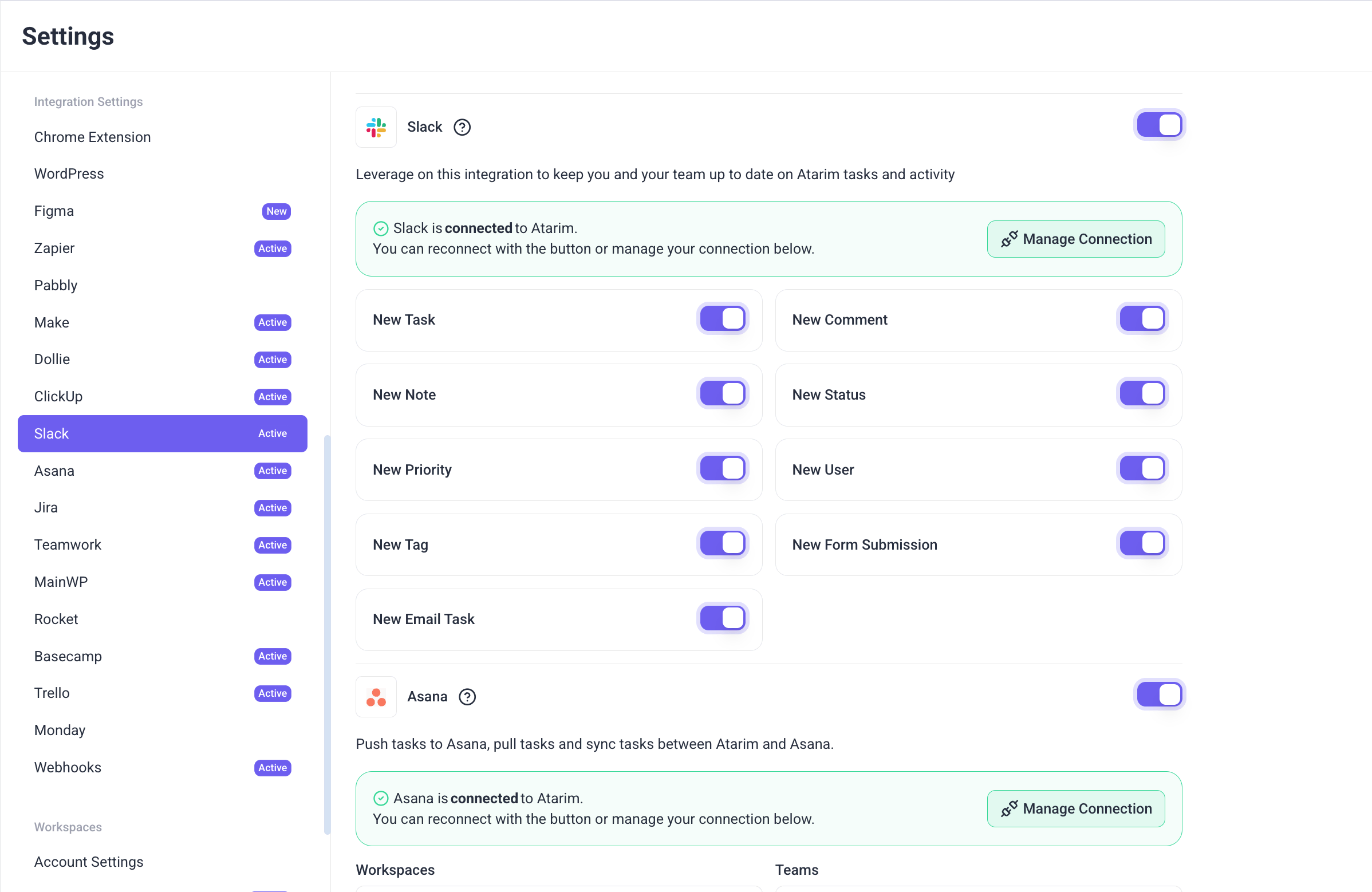 - Connect your desired tool (e.g., Slack, Trello) and customize how Atarim shares project updates.