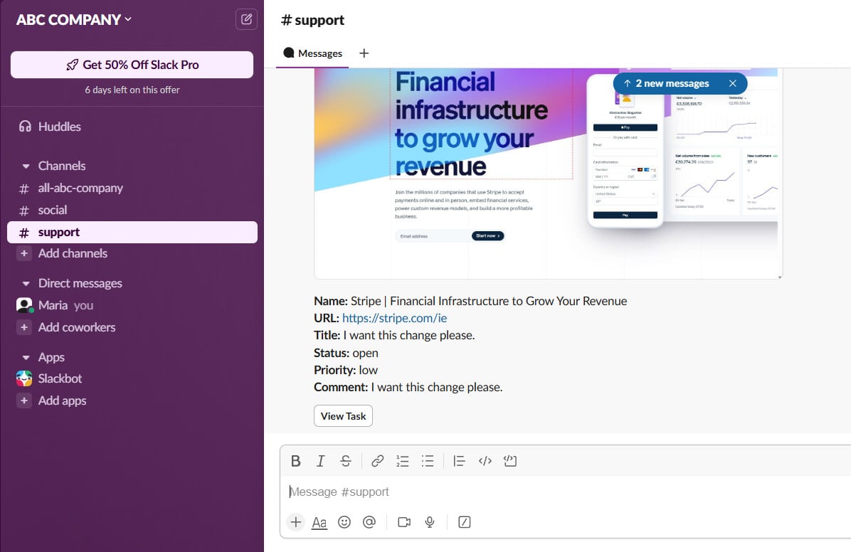 Example: When a task is created on a website, Slack will show a message with the task name, status, and a link to view it.