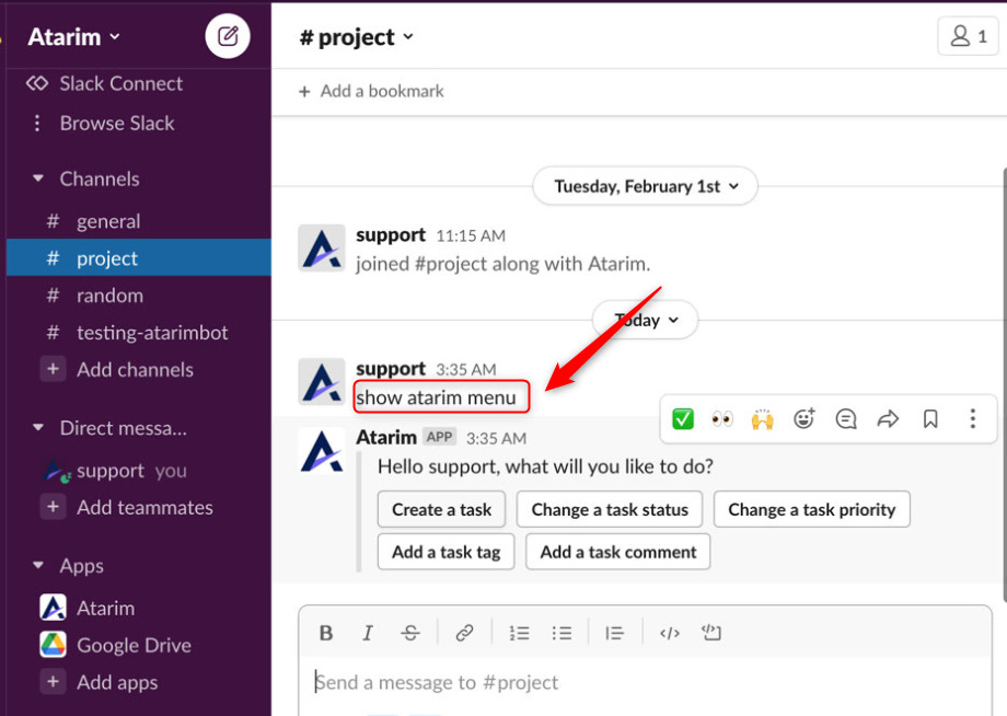 2. Type /atarim_help and press Enter