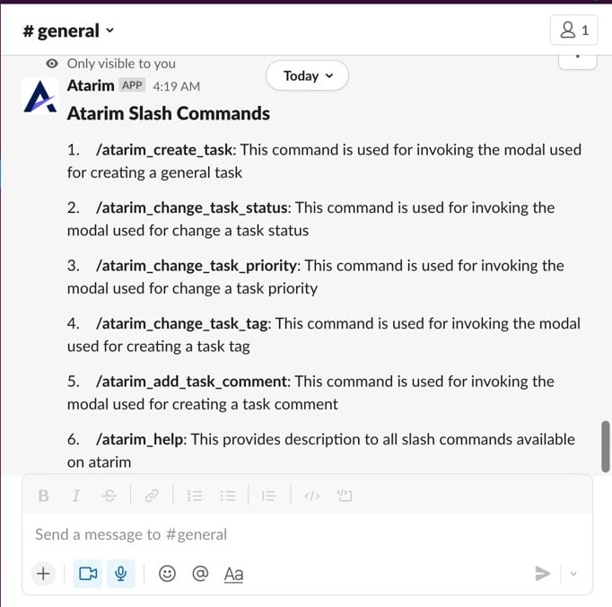 Slash commands in Slack begin with a / and allow users to perform actions by triggering apps directly from the message input field. Atarim supports several powerful slash commands designed to save time and simplify task workflows.